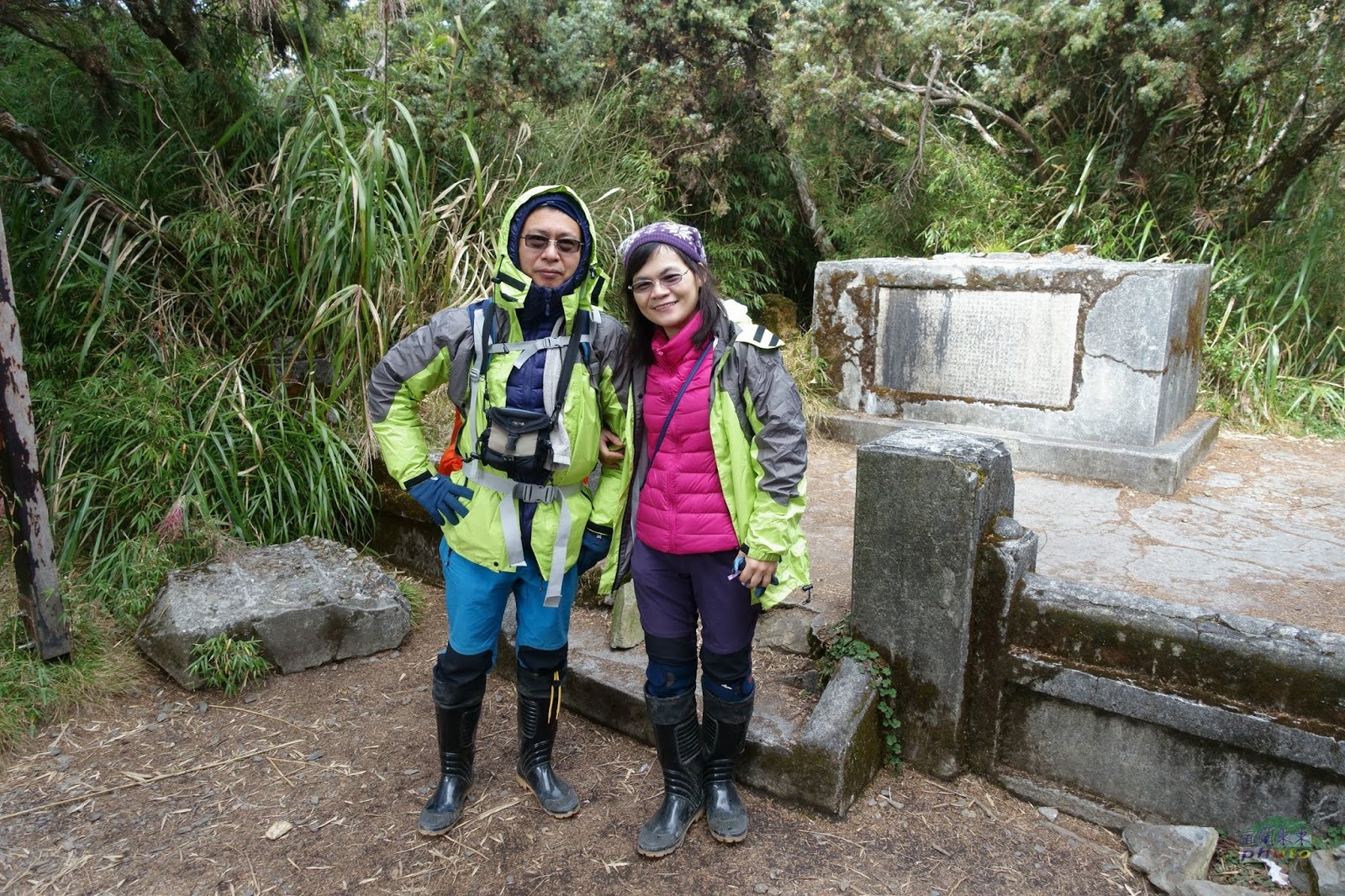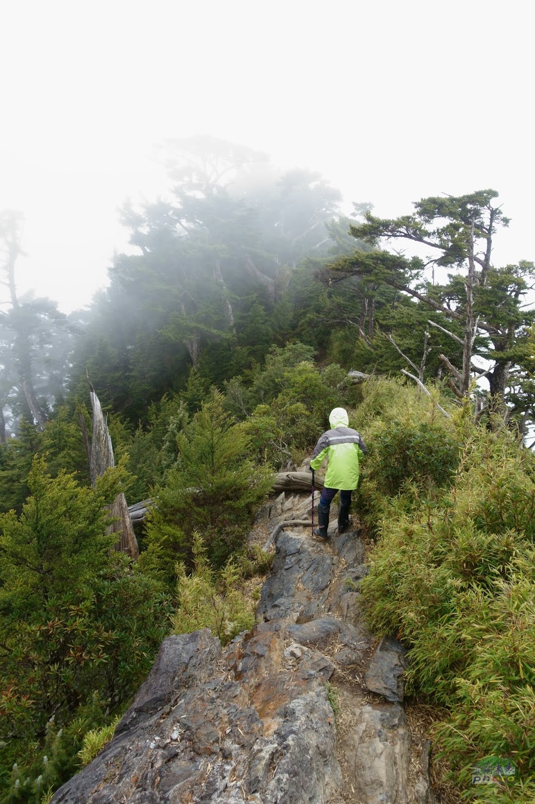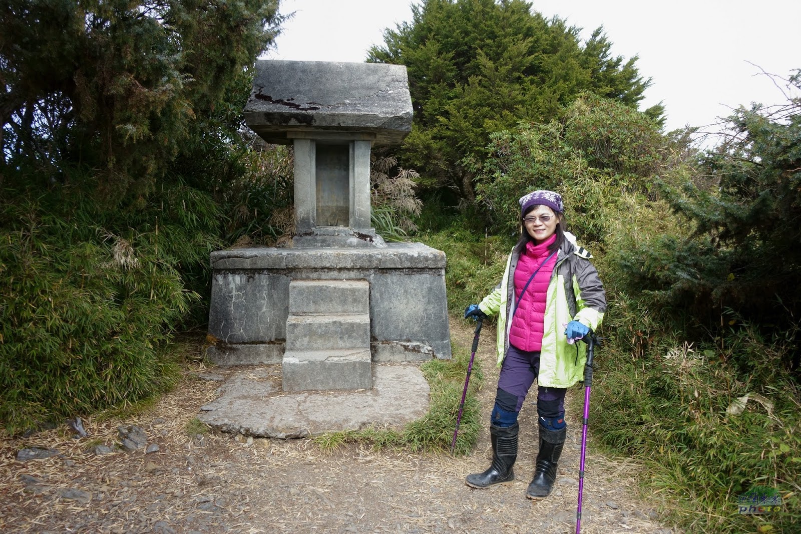 好不容易撐到8k的高砂義勇軍紀念碑和大武祠,已經12點多了,老爺說:只剩1k了, 這時若放棄,再上三角點機會不大,很可惜; 而喜多麗斷崖的夕陽雲海是還有機會看見的。於是在此休息片刻吃完午餐後,不管寒風刺骨,霧雨已來,便一鼓作氣往三角點衝!