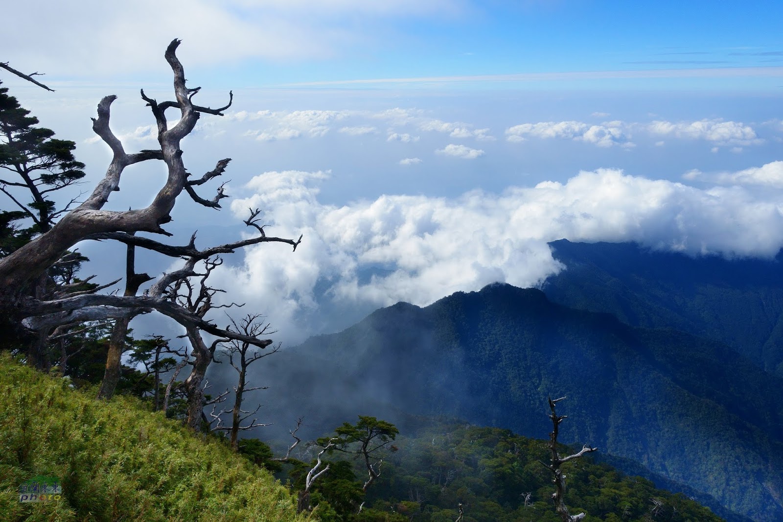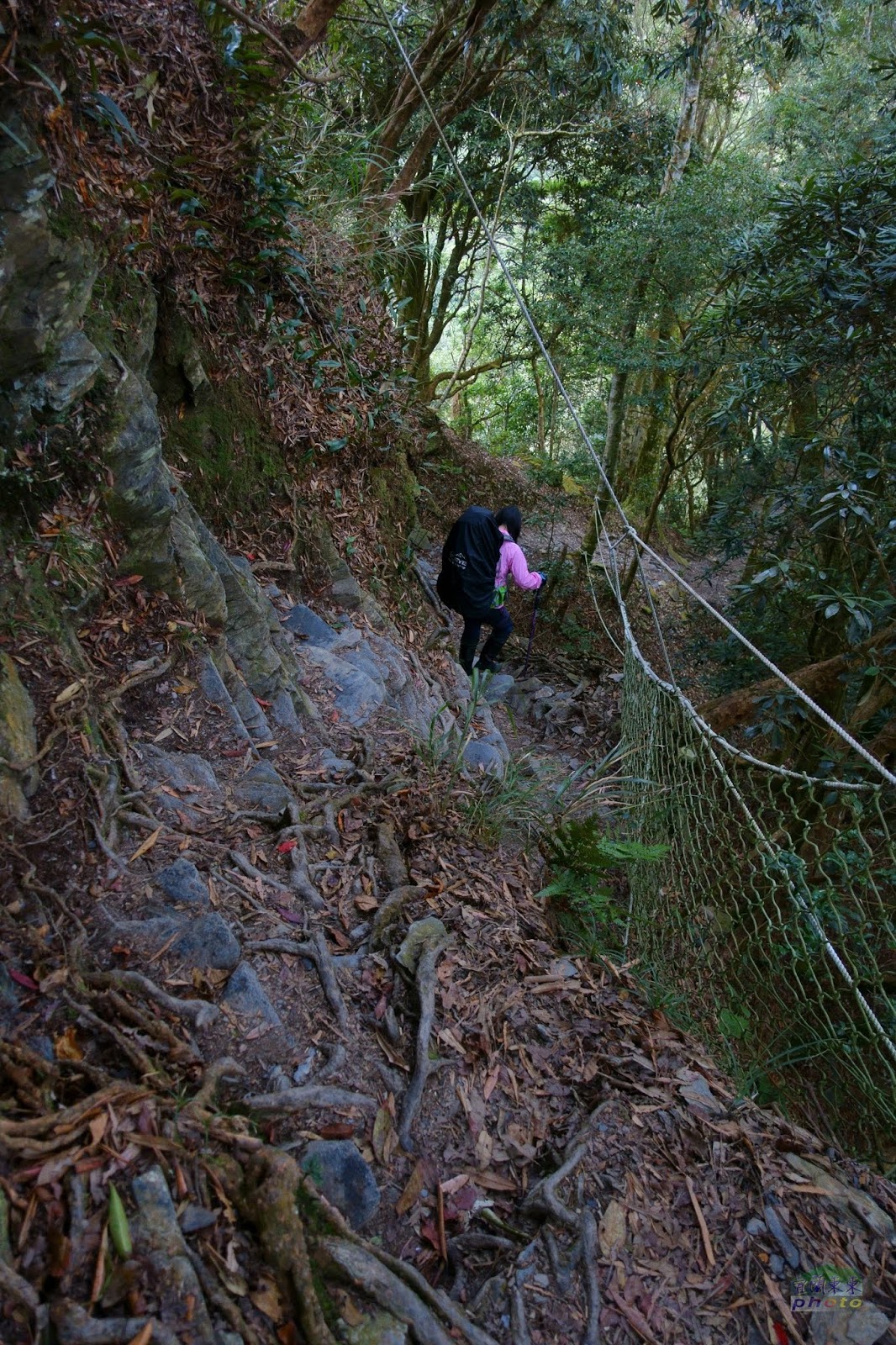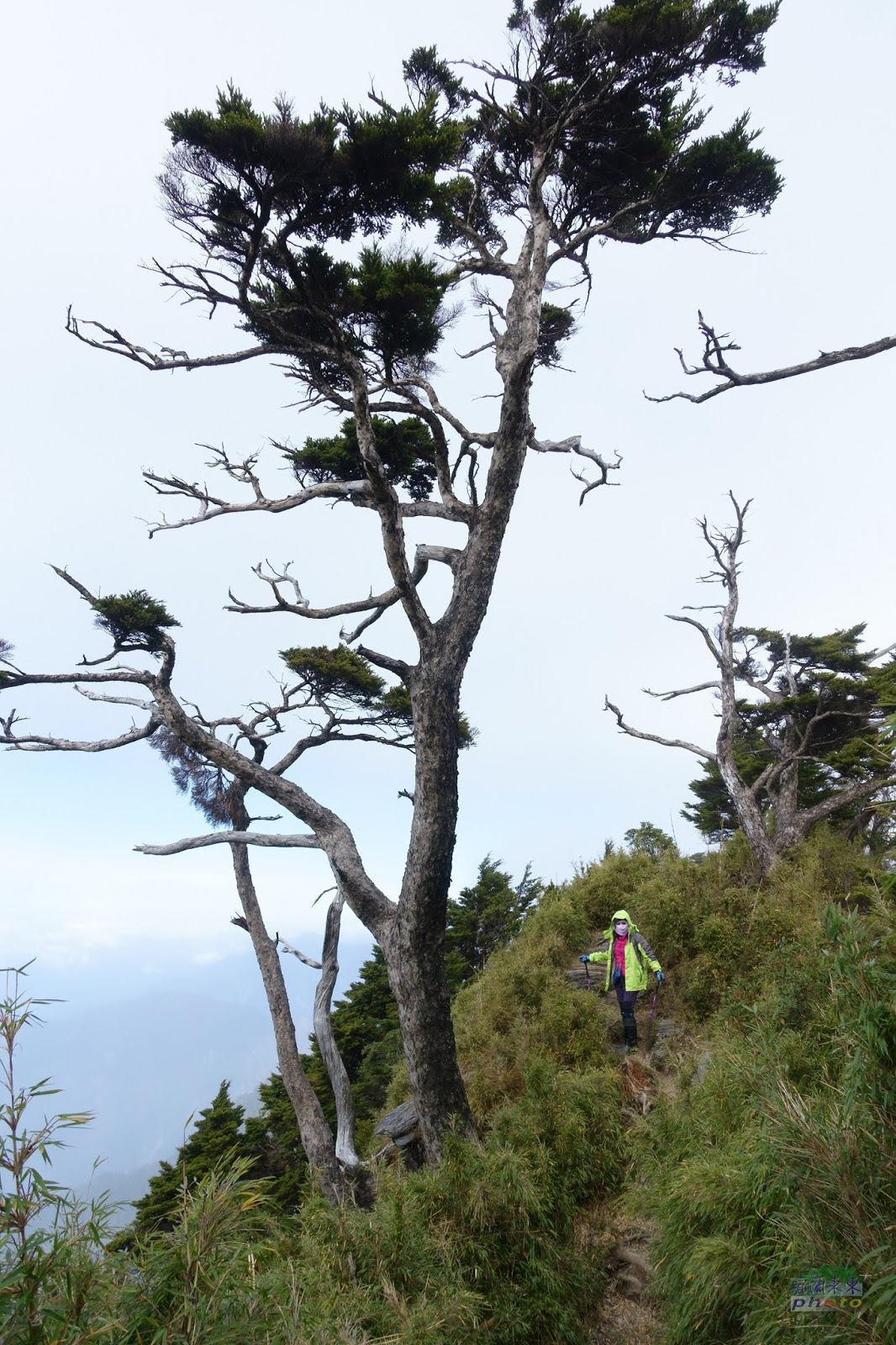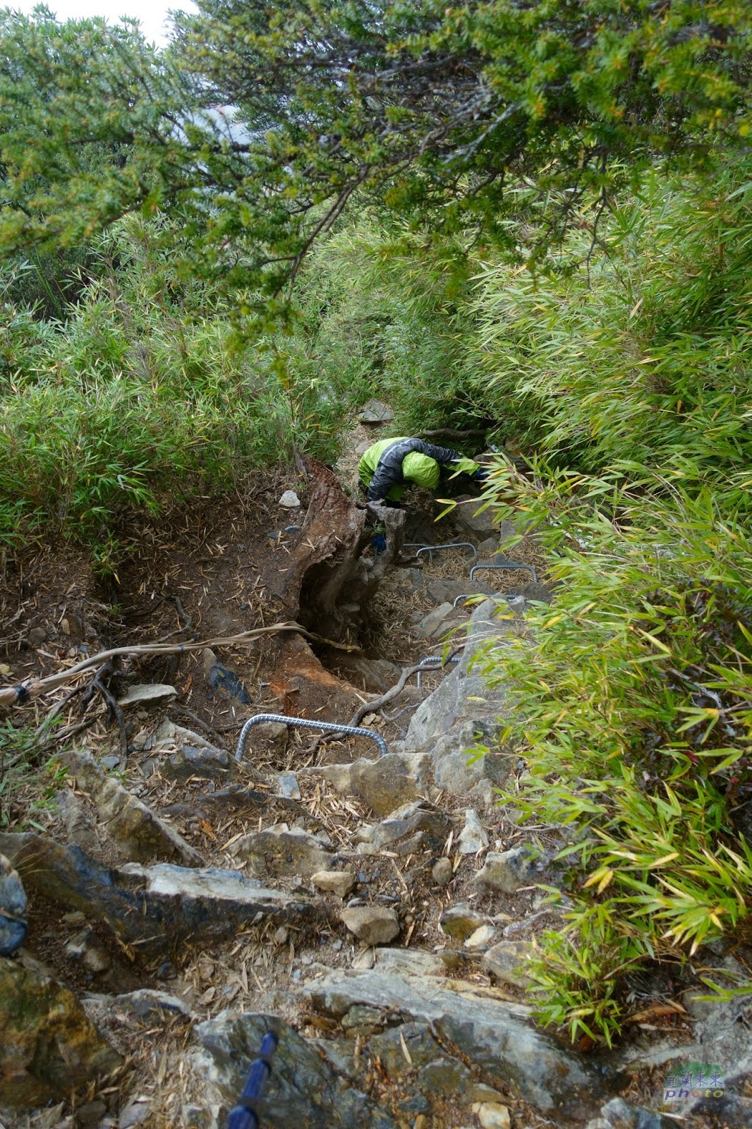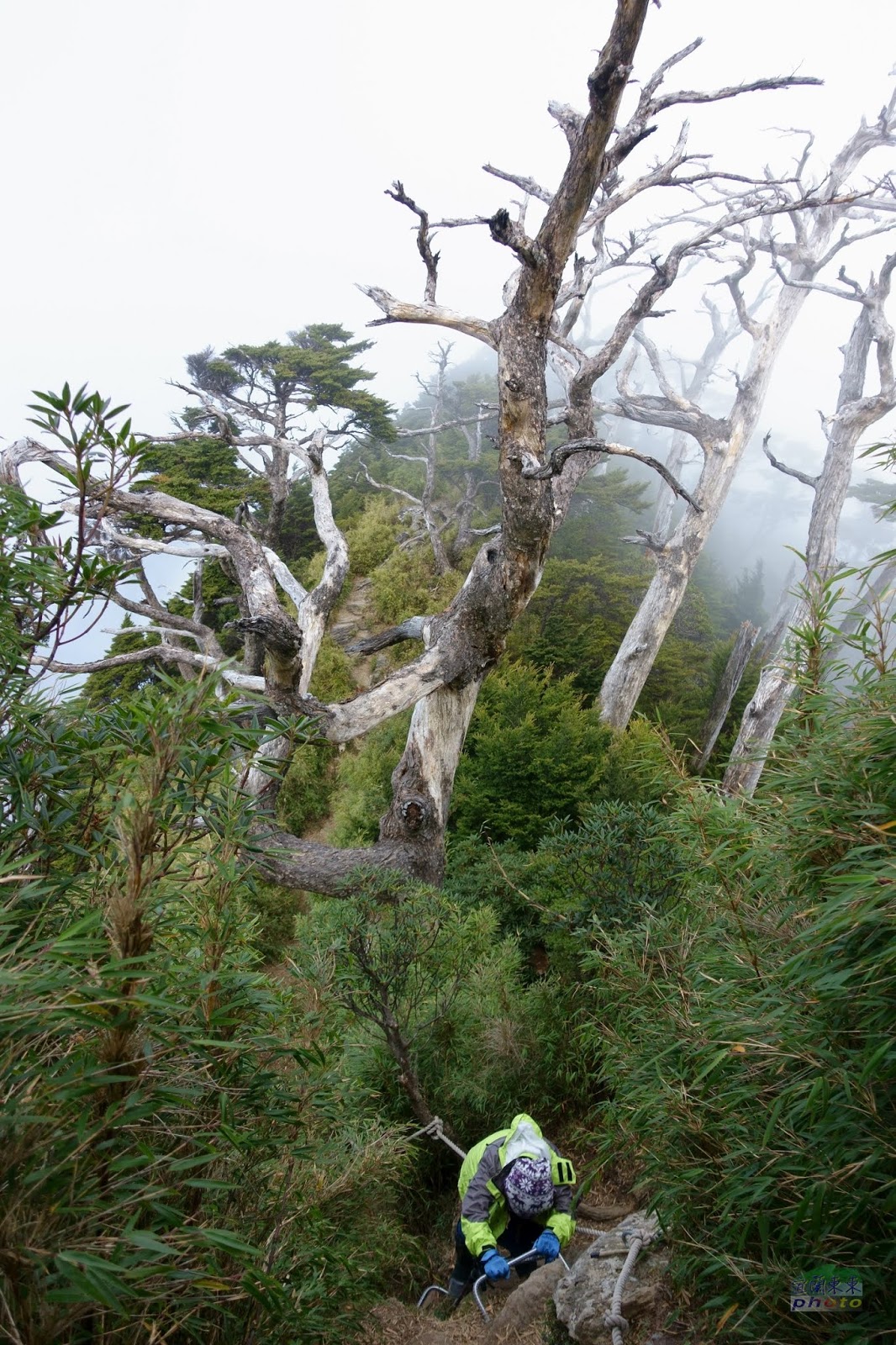 6k之後藍天白雲視野瞭濶,鐵杉林呈現美麗姿態,7k之後更為陡峭曲折,部分路段必須拉著繩索踩著ㄇ型鐵梯才能橫越或爬升岩壁,須小心再小心,此時體力耐力已透支,又喘又累,半路打盹,