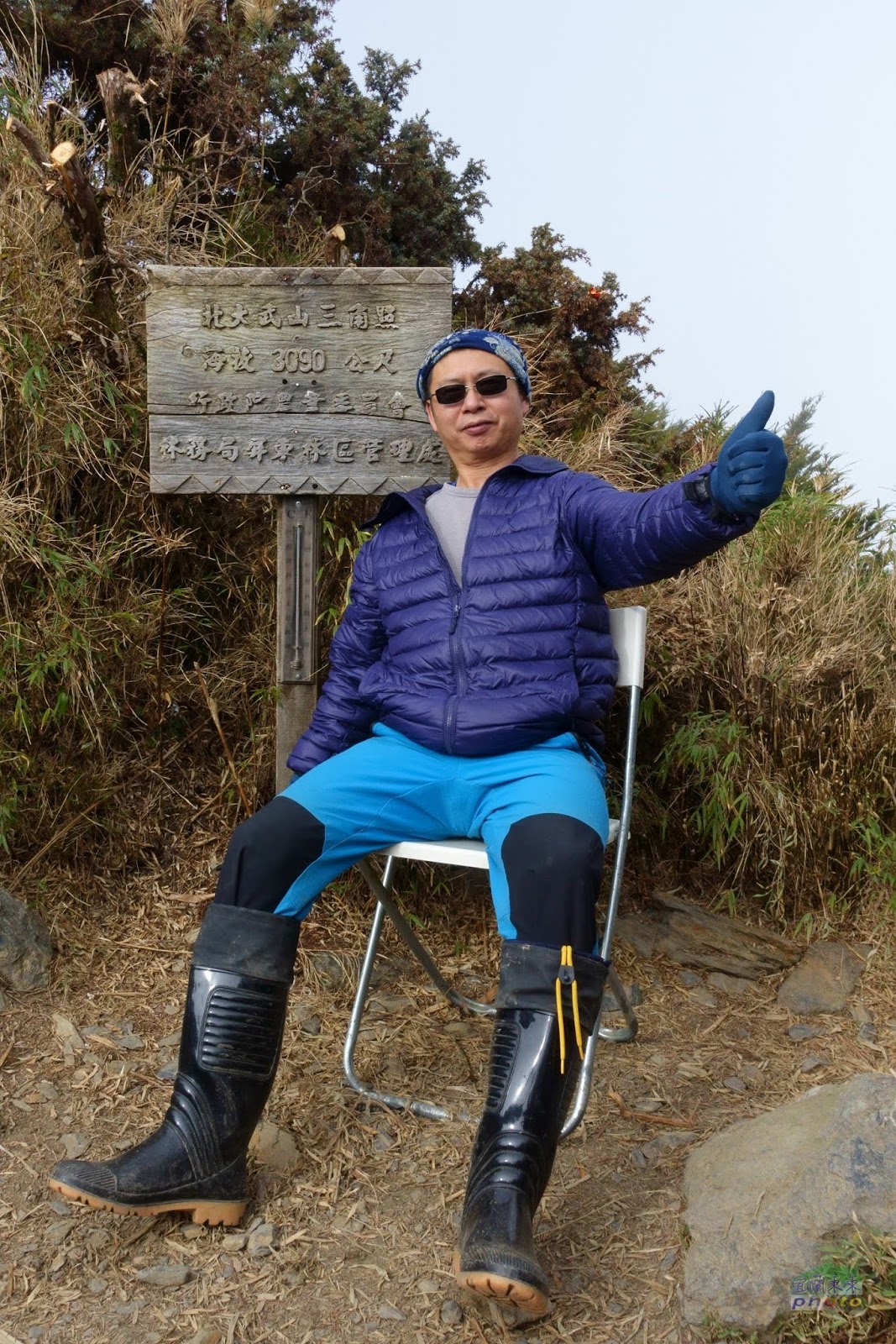 終於在14:00抵達北大武三角點,呼!一切辛苦值得了。更開心的是居然有張完好靠背椅可坐,真不知是哪位善心人士帶上來的,真是太感謝了,難得山頂還有些許陽光,趁此快速留影美景。我們是當日最晚到三角點的,所以此時此刻並無他人,可以盡情拍照留影,14:30趕緊下山。沿路有不少山友很神勇從新登山口到三角點一日單攻來回18k,也有不少山友到大武神木或大武祠就放棄的。